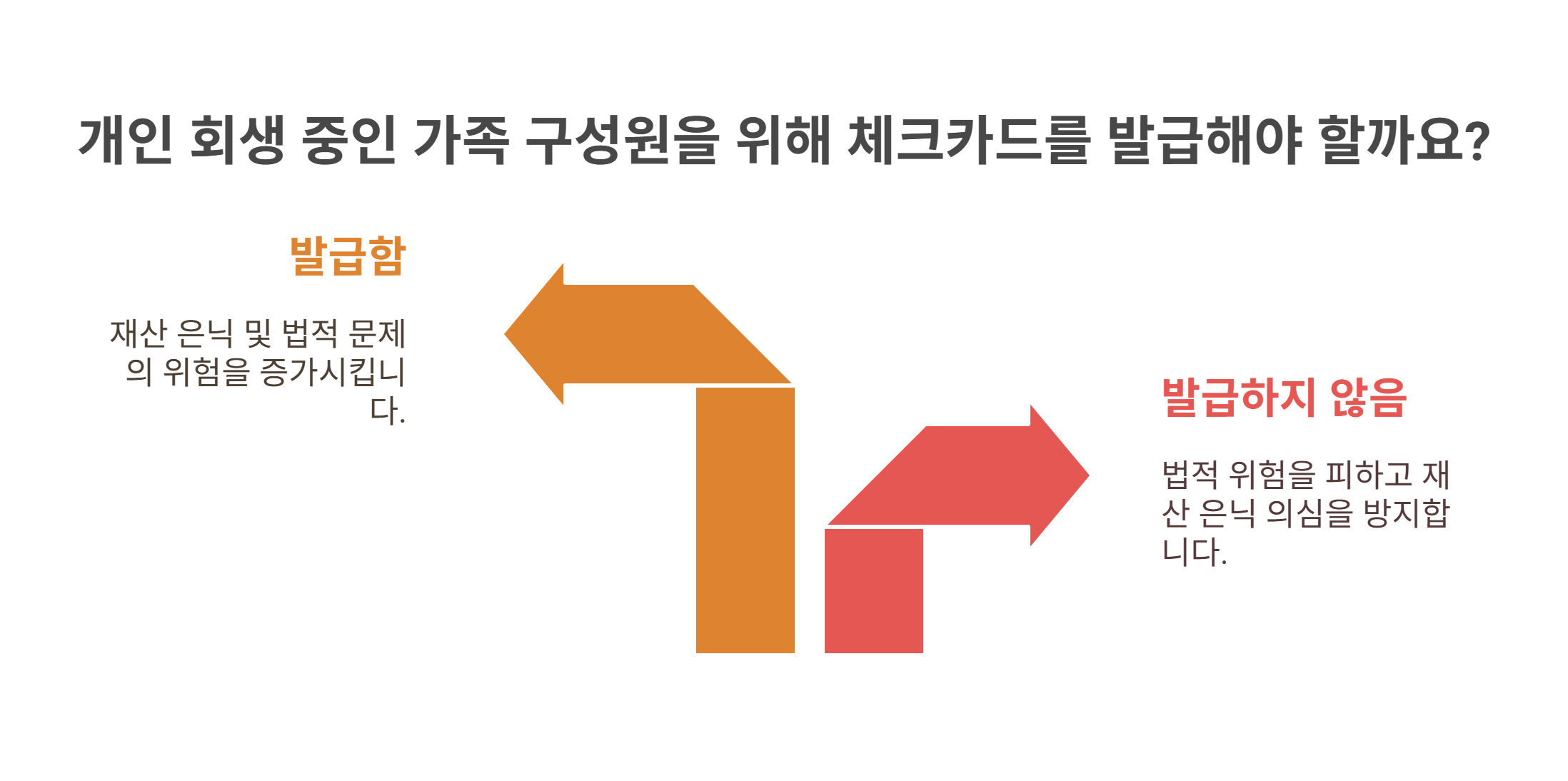 특히 개인회생 절차 중인 가족에게 체크카드를 만들어준다면, 나도 모르게 재산을 ‘대리 소유’해주는 셈이 될 수 있어요.