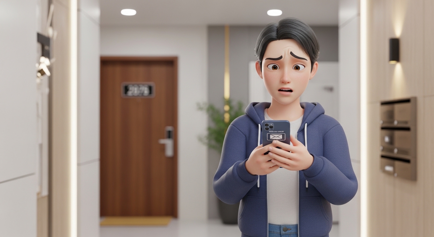 문 앞에 붙어 있는 '우편물 도착 안내서'는 가장 중요한 힌트입니다.