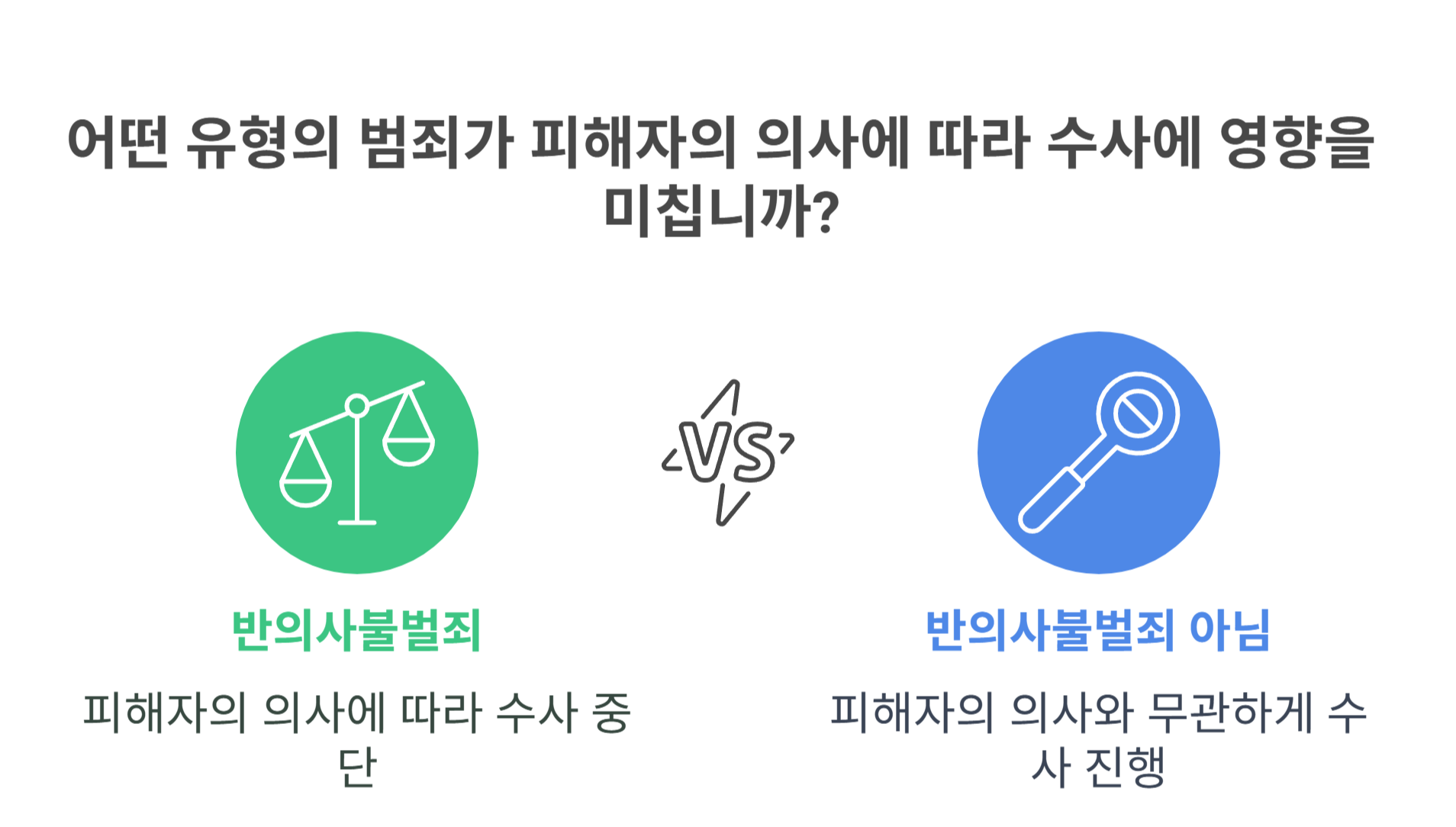 ✅ 반의사불벌죄에만 즉각적 수사 중단 효과가 있으며, 그 외 사건은 수사기관 판단에 달려 있어요.