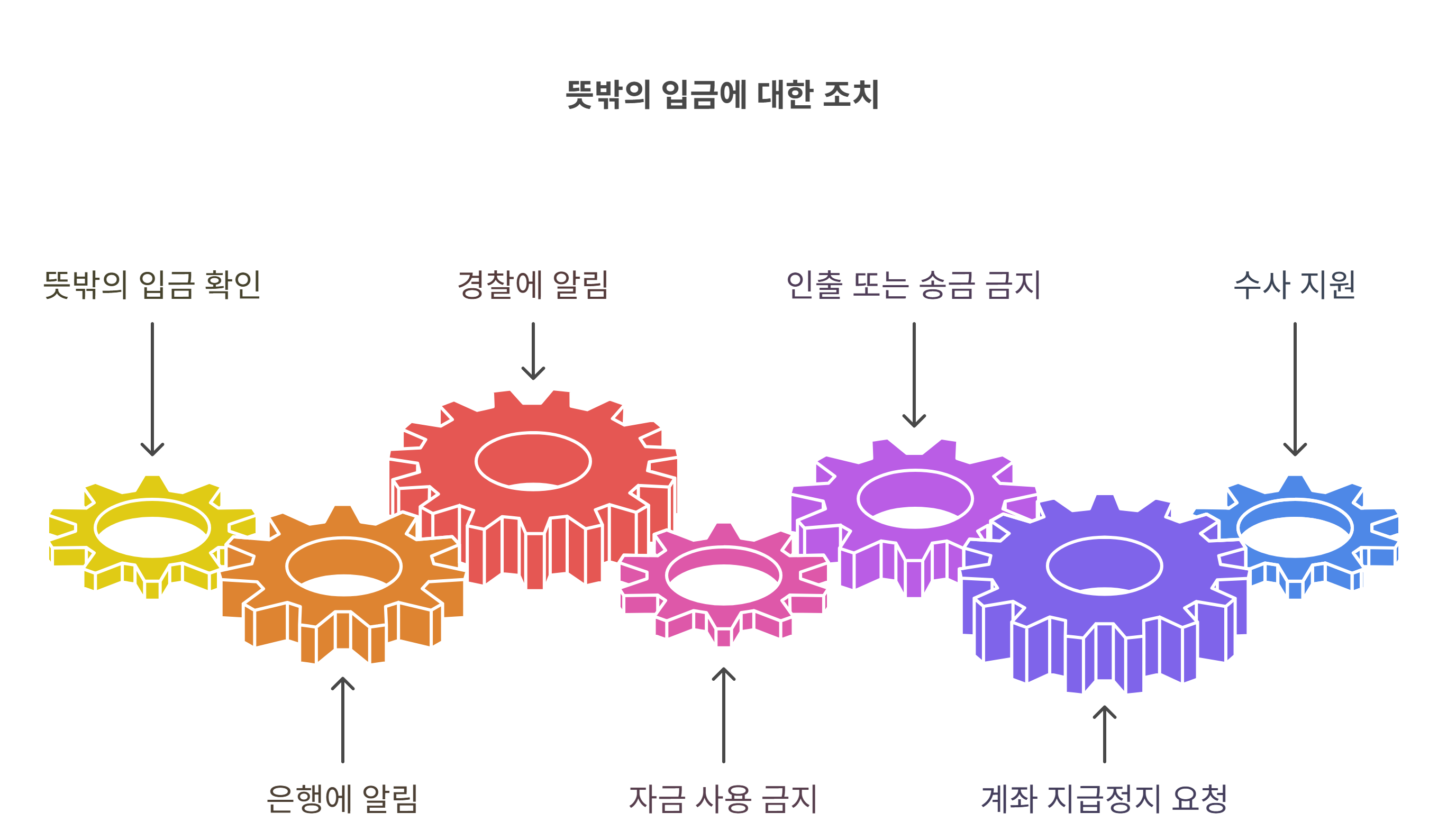 | 모르는 돈 입금 | 은행 또는 112에 즉시 신고 | 공범 혐의에서 제외될 수 있음 |
