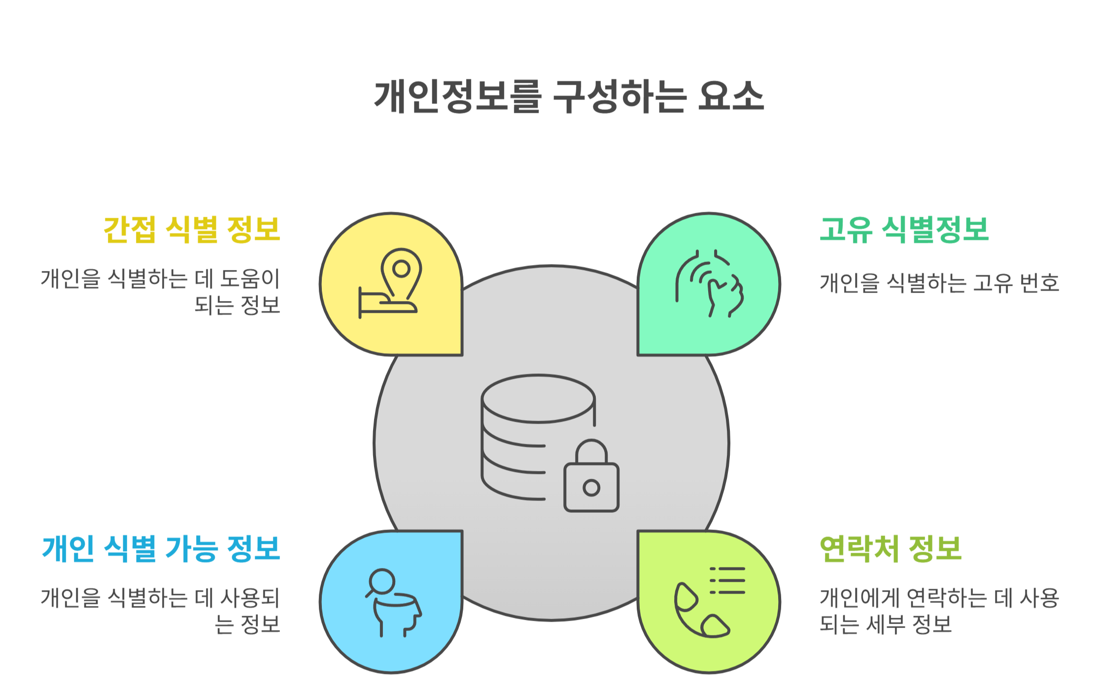 | 간접 식별 정보 | IP주소, 위치정보, 특정 SNS 닉네임 등 |