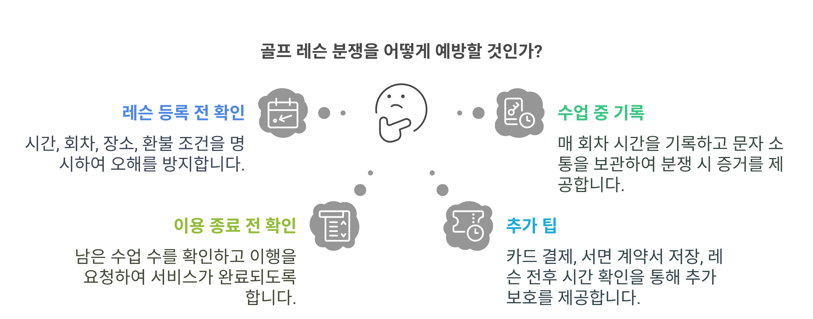 골프 레슨은 고가의 개인 수업인 만큼, 사전 확인과 기록만 잘 해두면 불필요한 분쟁을 막을 수 있어요.