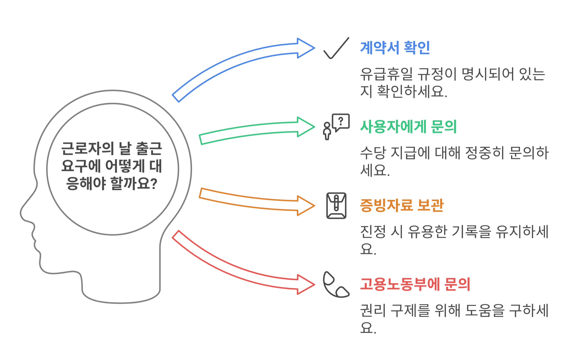 - 2. 사용자에게 정중히 문의: "근로자의 날은 유급휴일로 알고 있는데, 수당 지급 여부를 확인해 주실 수 있나요?"