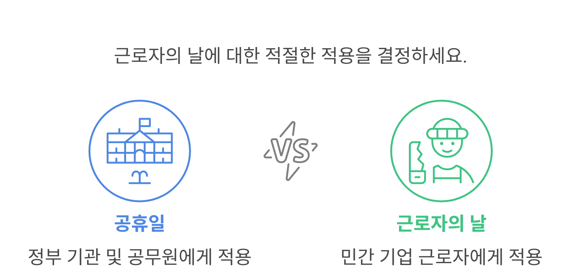 - 공무원 및 공공기관 관리자: 공휴일 적용 받지만, 근로자의 날은 해당 안 됨