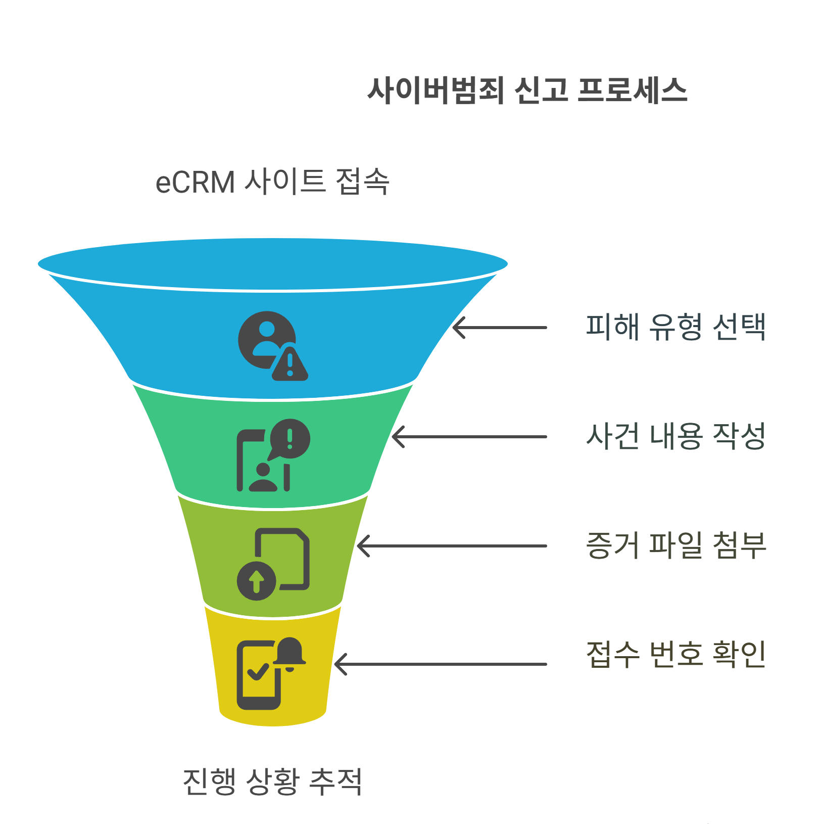 eCRM은 피해사실 작성 → 증거 파일 첨부 → 접수번호 발급 순서로 진행됩니다.