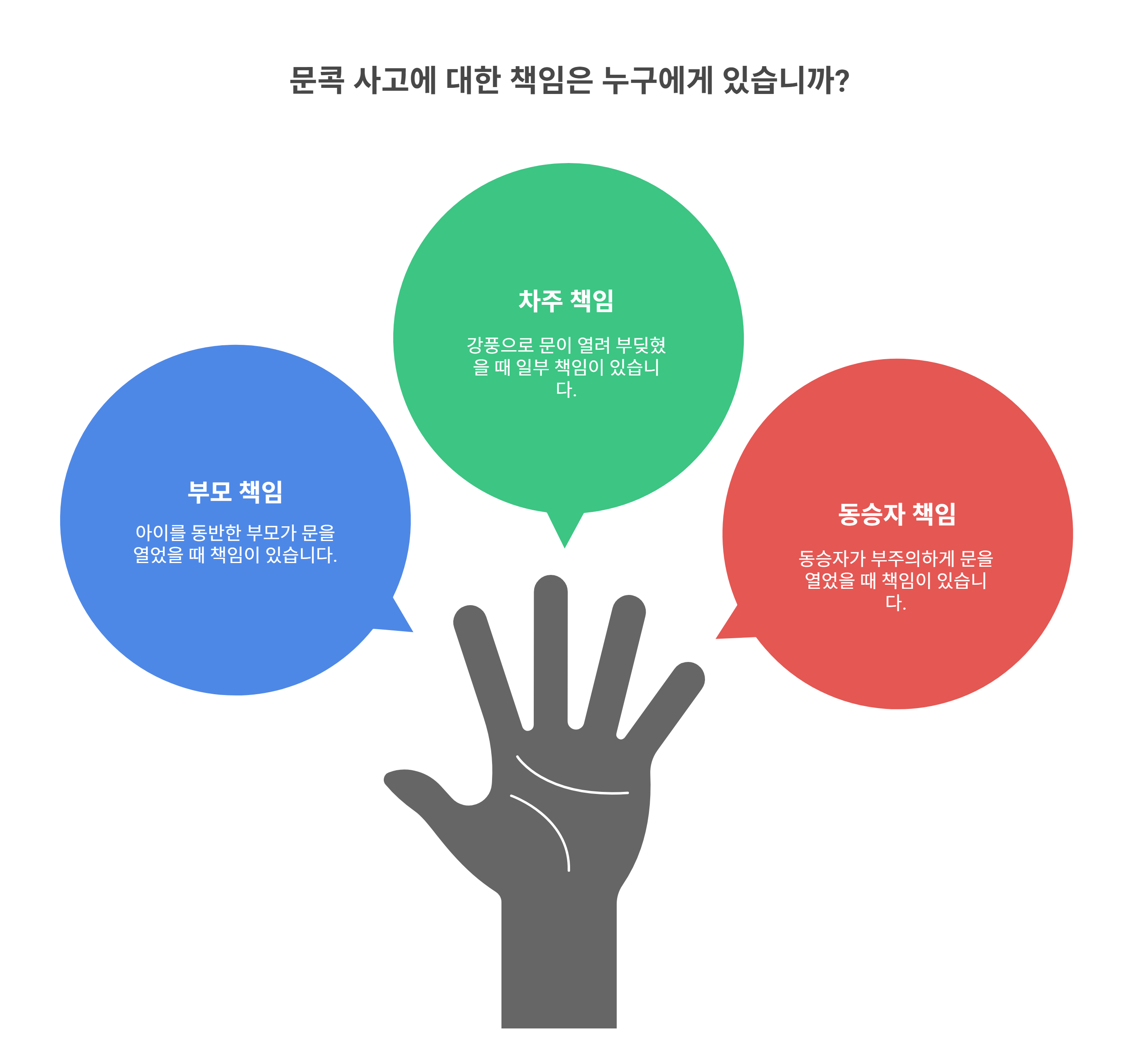 문콕 사고는 승차 중 문을 연 사람(운전자 또는 동승자)에게 책임이 있어요.