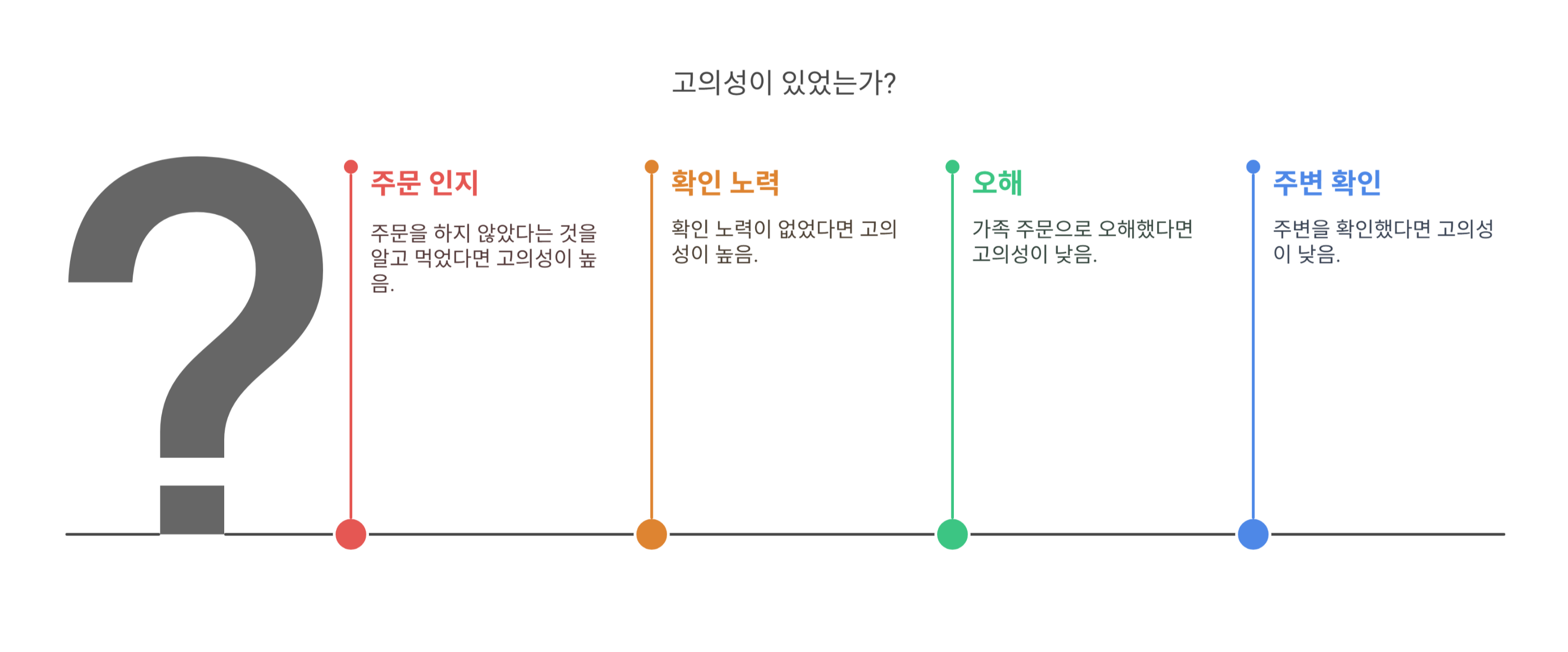 음식을 받기 전, 수령자 명이나 메뉴를 확인하지 않고 무작정 개봉해 섭취했다면 고의성이 있다고 볼 여지가 높아요.
