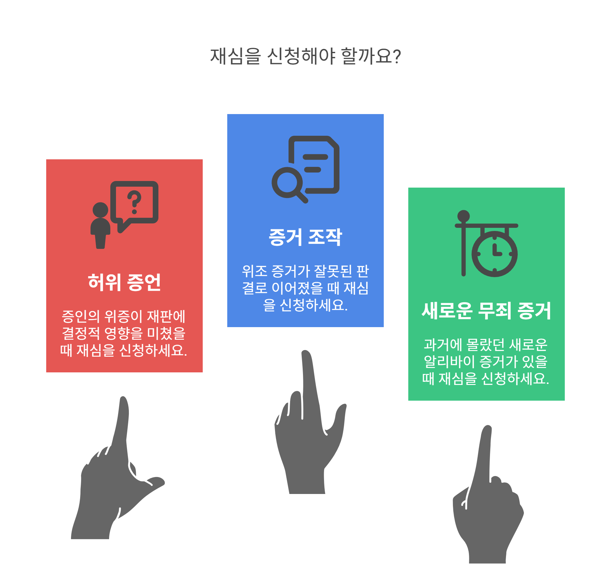 ⚠️ 주의: 단순한 억울함만으로는 재심이 어렵고, 법적 사유와 명백한 증거가 있어야 합니다.
