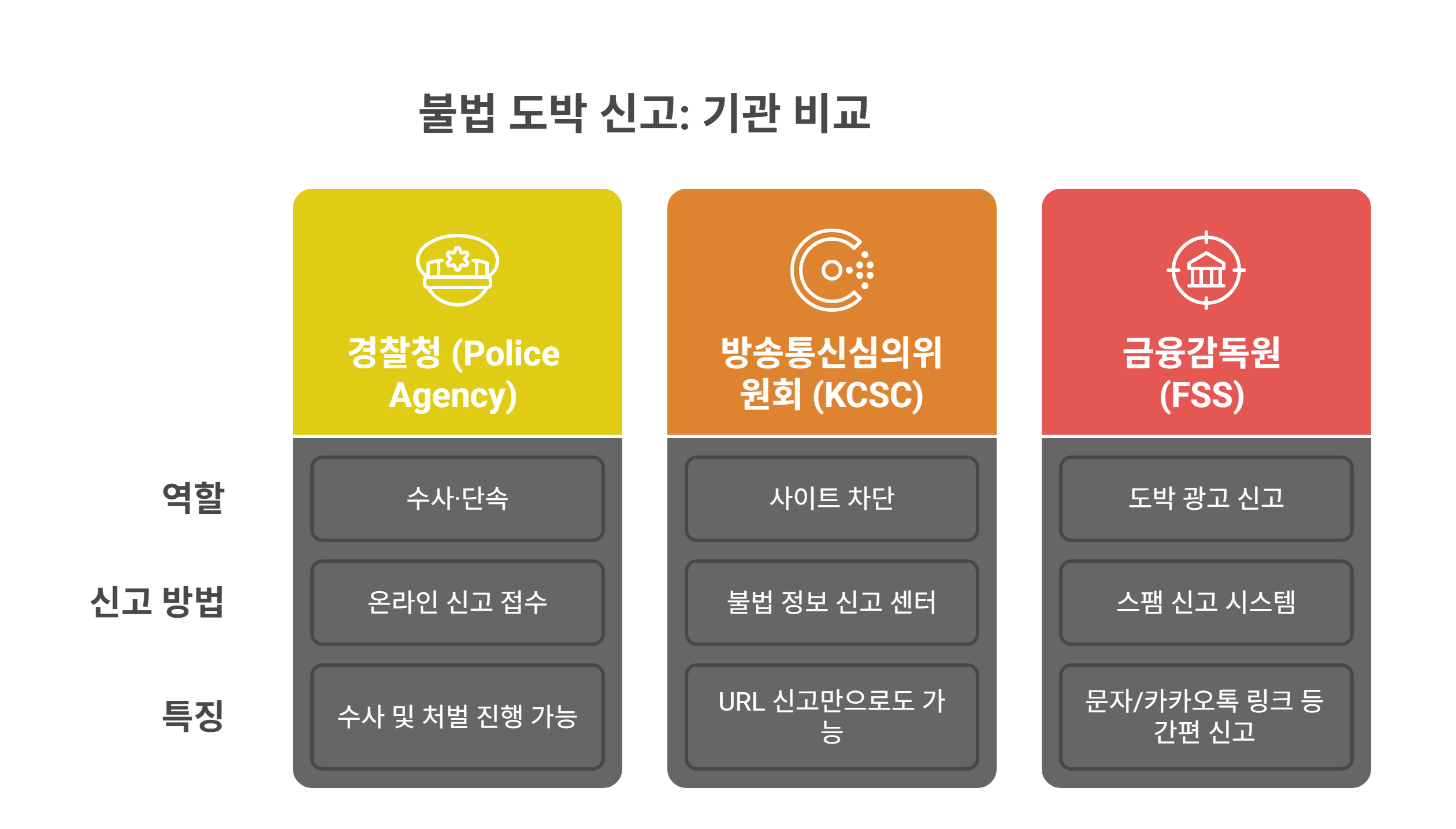 불법도박 신고는 아래 기관에서 모두 접수 가능해요