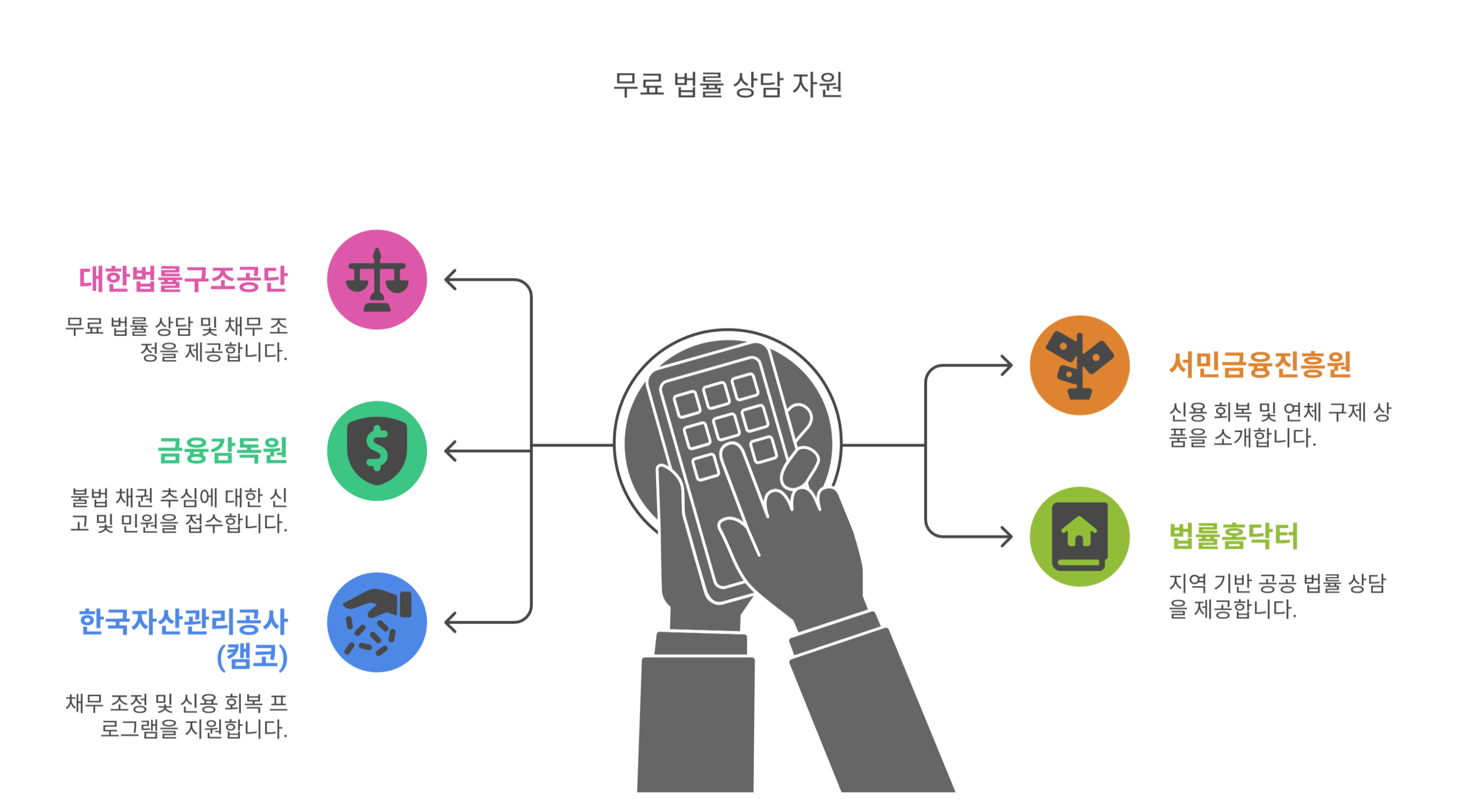 정부기관, 지자체, 비영리 기관 등에서는 무료 법률상담과 채무조정 프로그램을 운영 중입니다.