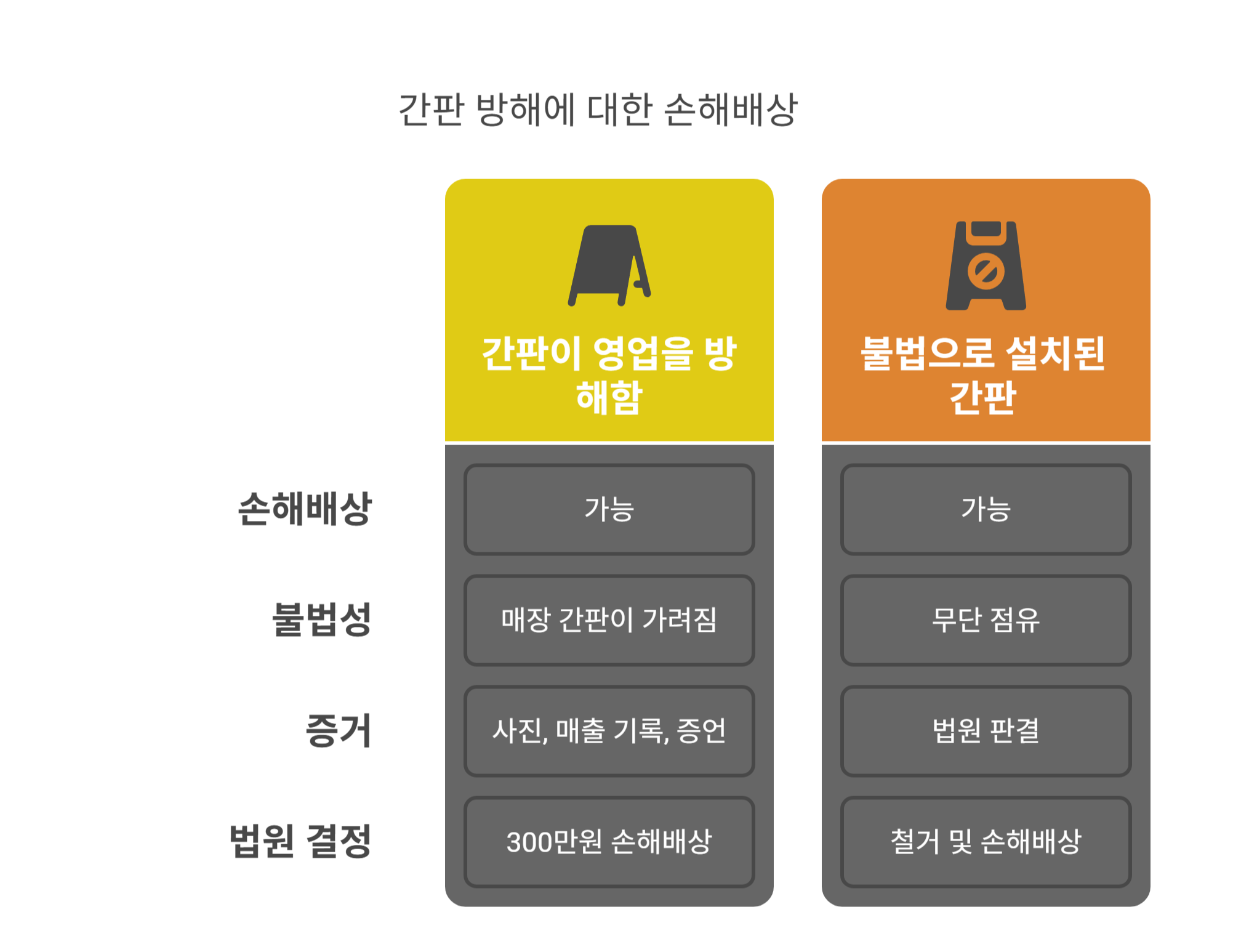 | 간판이 시야를 완전히 가린 경우 | 영업방해 및 사권 침해 (민법 제750조) |