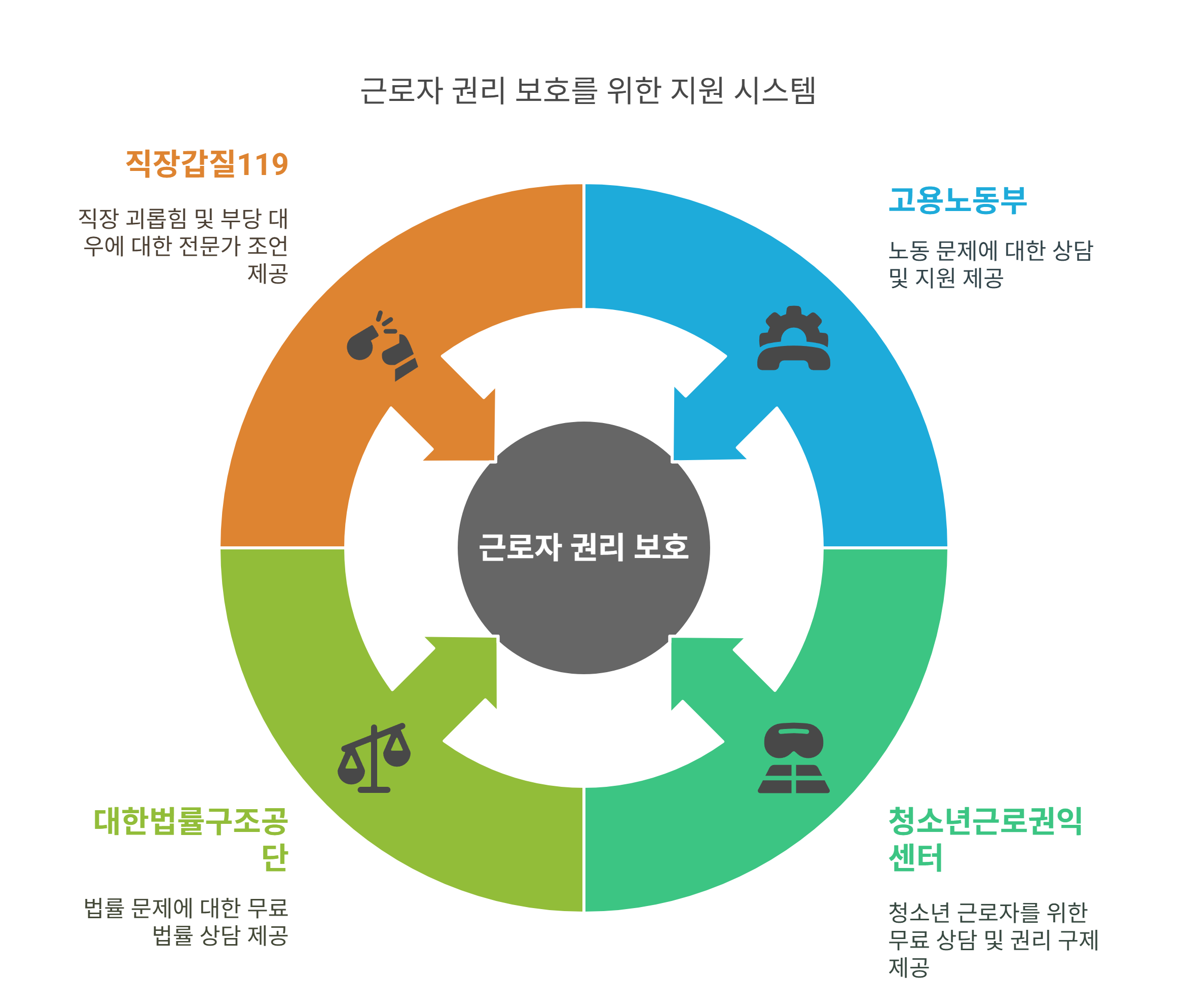 다행히 우리나라에는 근로자 보호를 위한 기관과 상담 채널이 다양하게 마련되어 있어요.