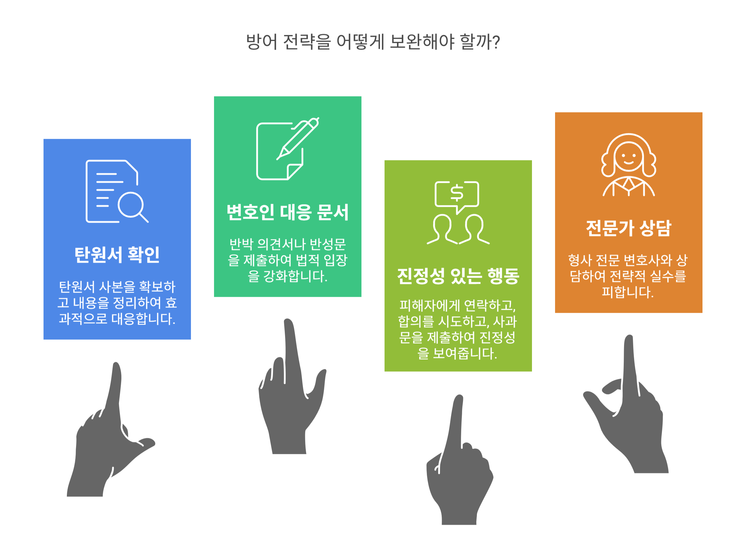 다음은 피고인과 변호인이 방어 전략에서 어떤 점을 보완해야 하는지 정리해볼게요! 💡