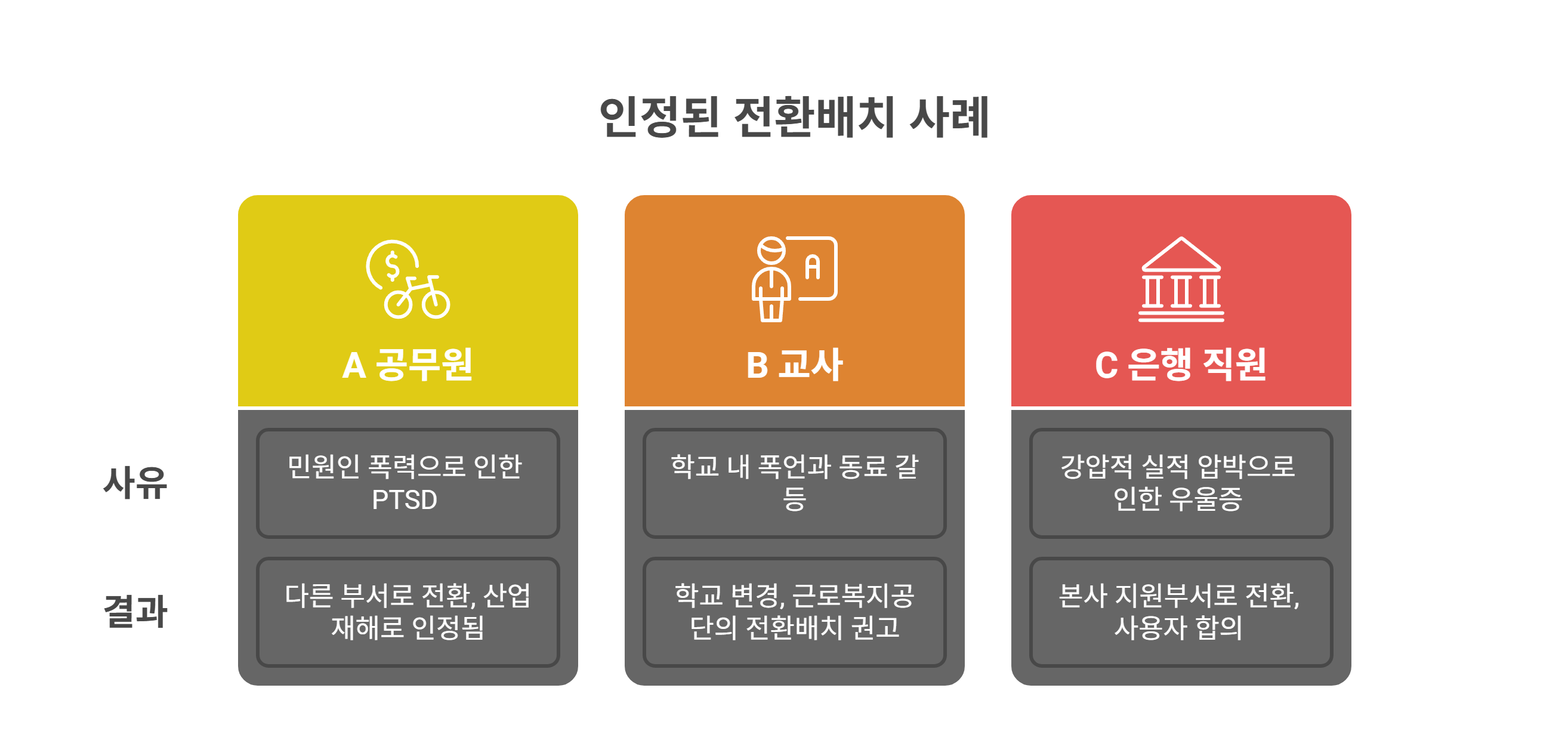 전환배치는 단순한 배려가 아니라, 정신적 피해를 줄이기 위한 필수 조치로 법적으로도 인정된 바 있습니다.