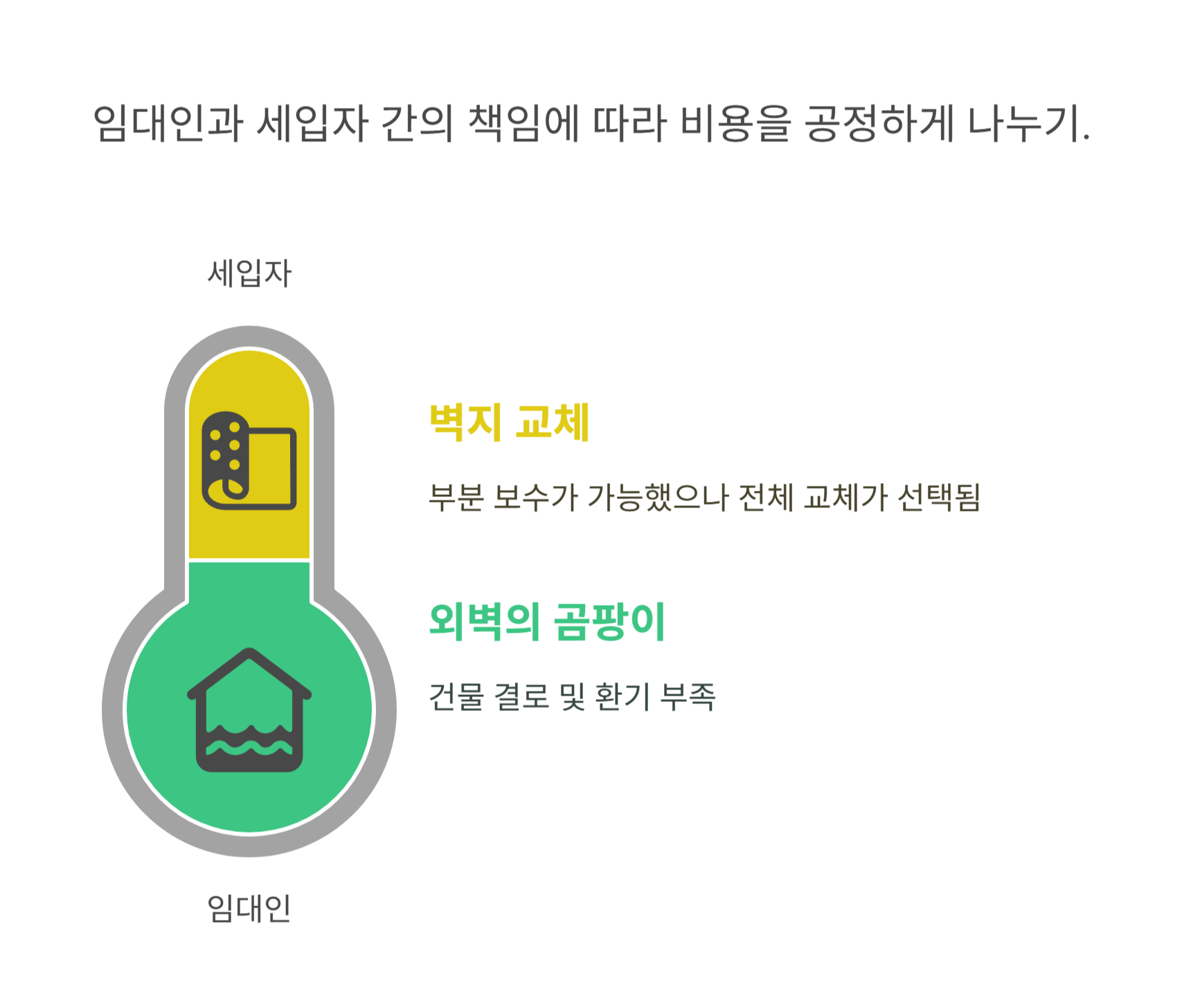 곰팡이와 벽지 문제의 원인이 건물 구조와 사용자 관리의 복합 요인일 경우, 수리비를 임대인과 세입자가 일정 비율로 분담하기도 합니다.