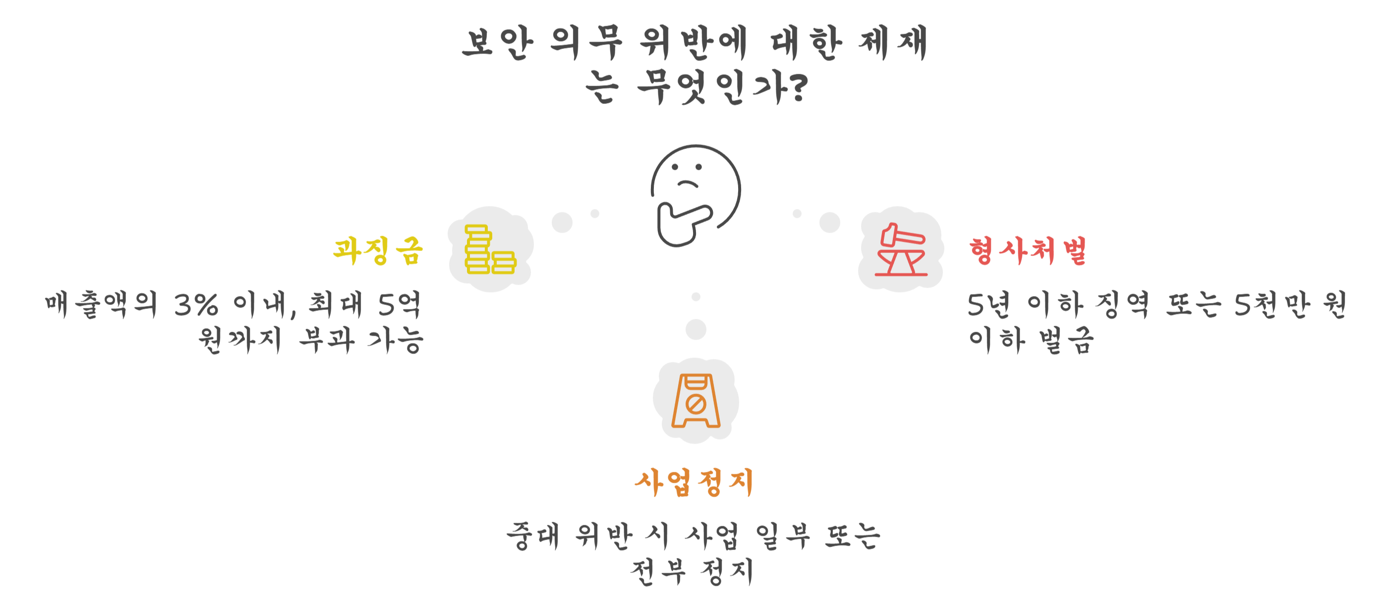 ✅ 보안 의무를 위반하면 과징금, 형사처벌, 손해배상 책임까지 모두 발생할 수 있어요.