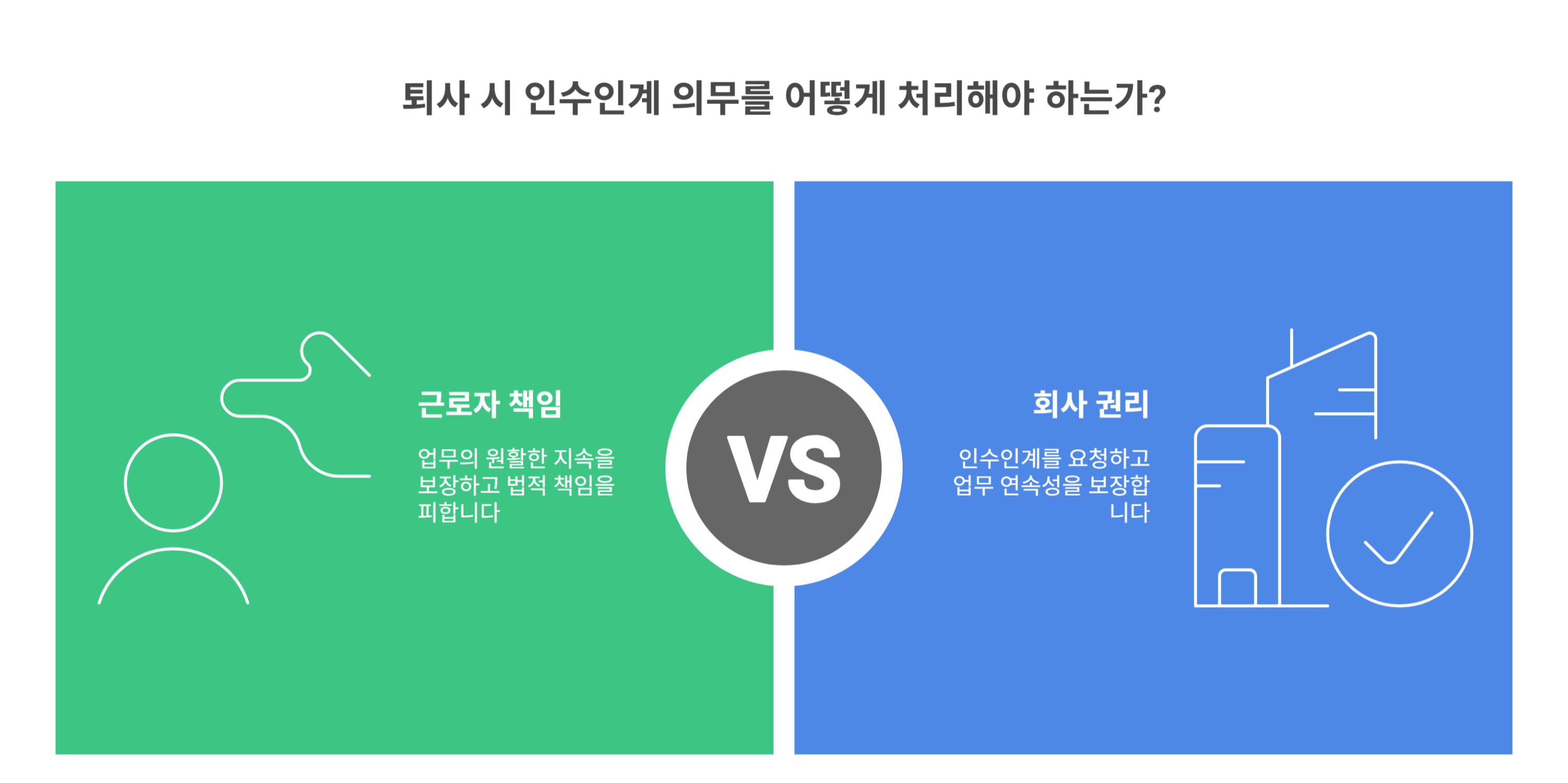 💡 TIP: 퇴사 전 반드시 회사와 협의하여 인수인계 일정과 항목을 미리 정리하는 것이 좋아요. 서면으로 남겨두면 더욱 확실합니다!