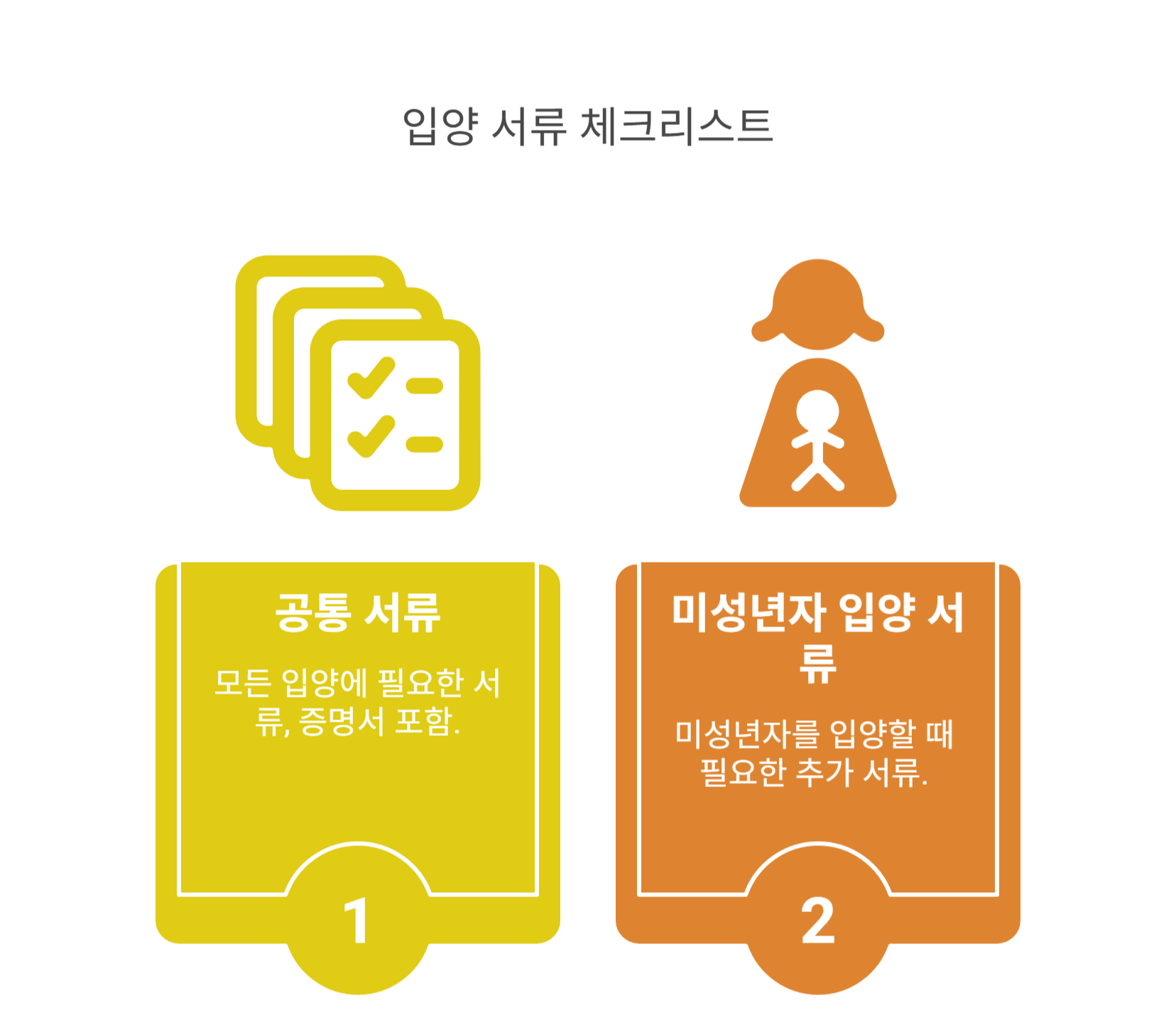 입양신고서, 가족관계증명서 등은 공통 필수 항목입니다.