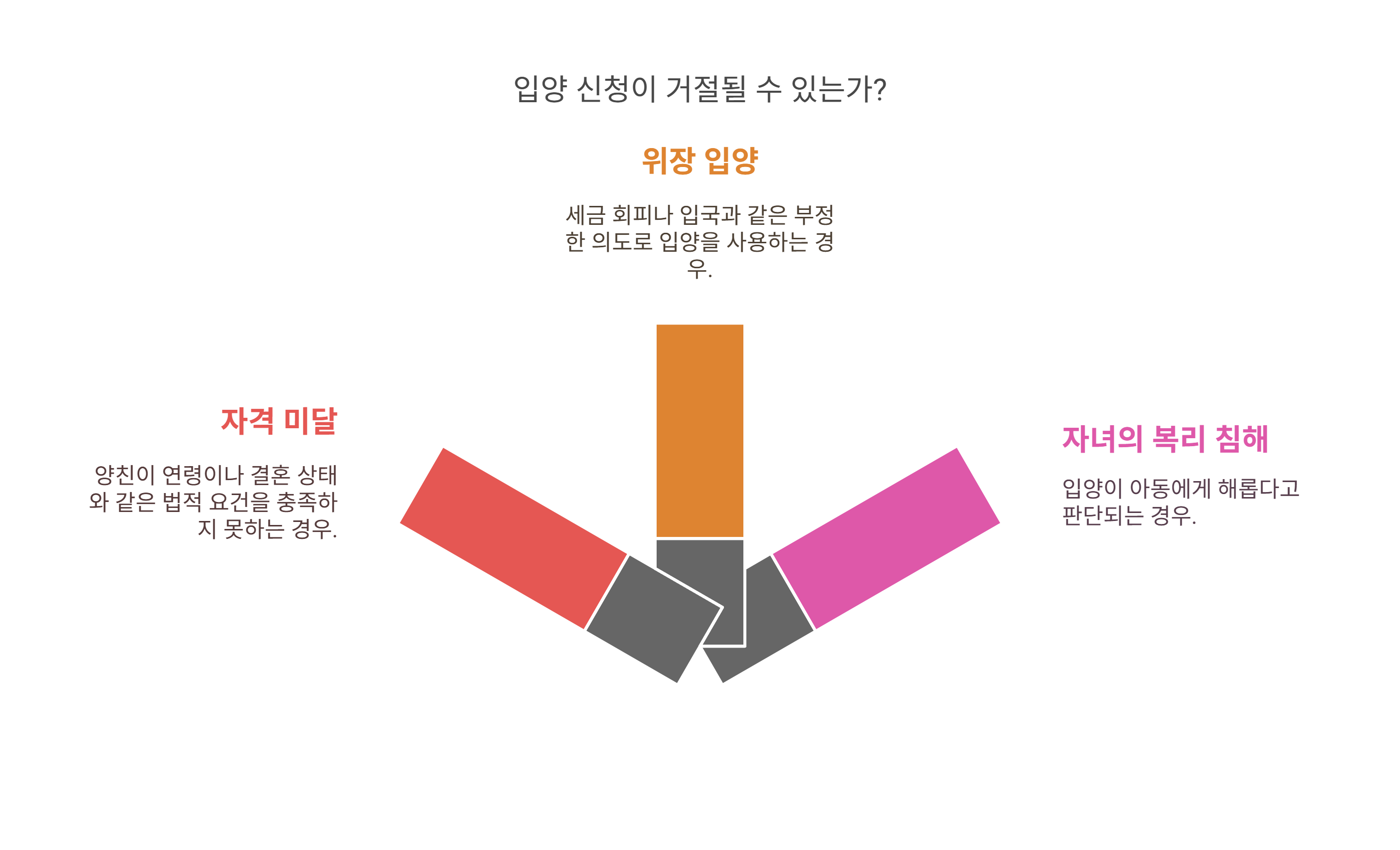 입양 신청이 거절될 수 있는 이유는 양부모의 자격 미비, 입양 목적의 불법성, 복리 침해 등이 있습니다.