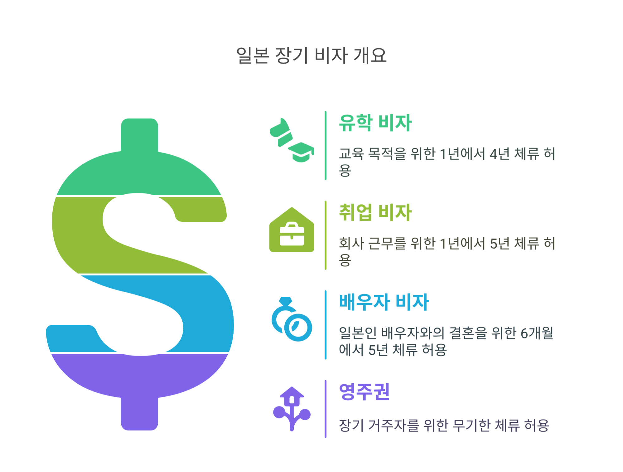 ✅ 일본 장기 체류 비자는 목적에 따라 다양하게 구분돼요.