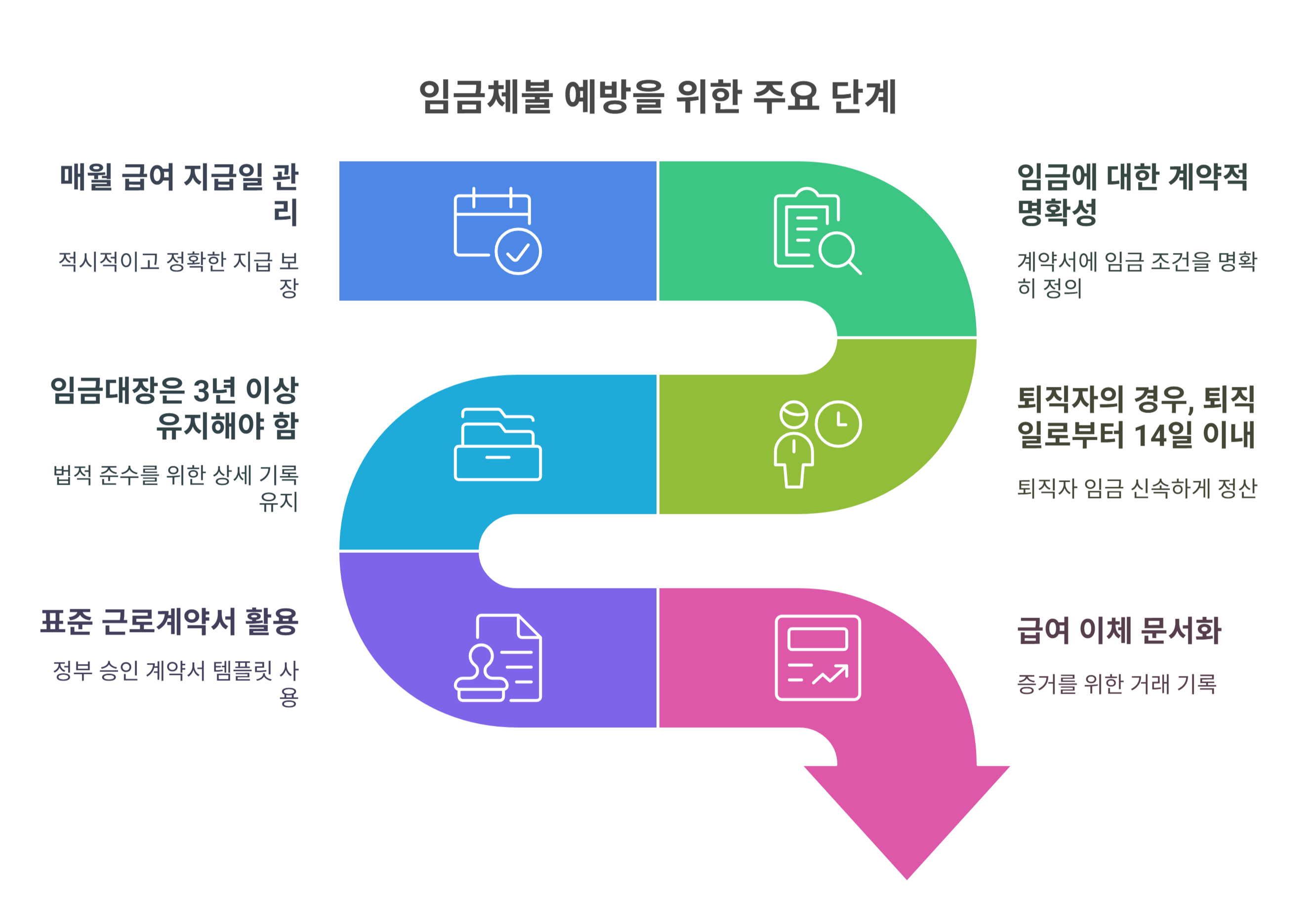 임금체불을 예방하려면 무엇보다도 급여 관리의 체계화와 정확한 지급시기 준수가 필수예요.