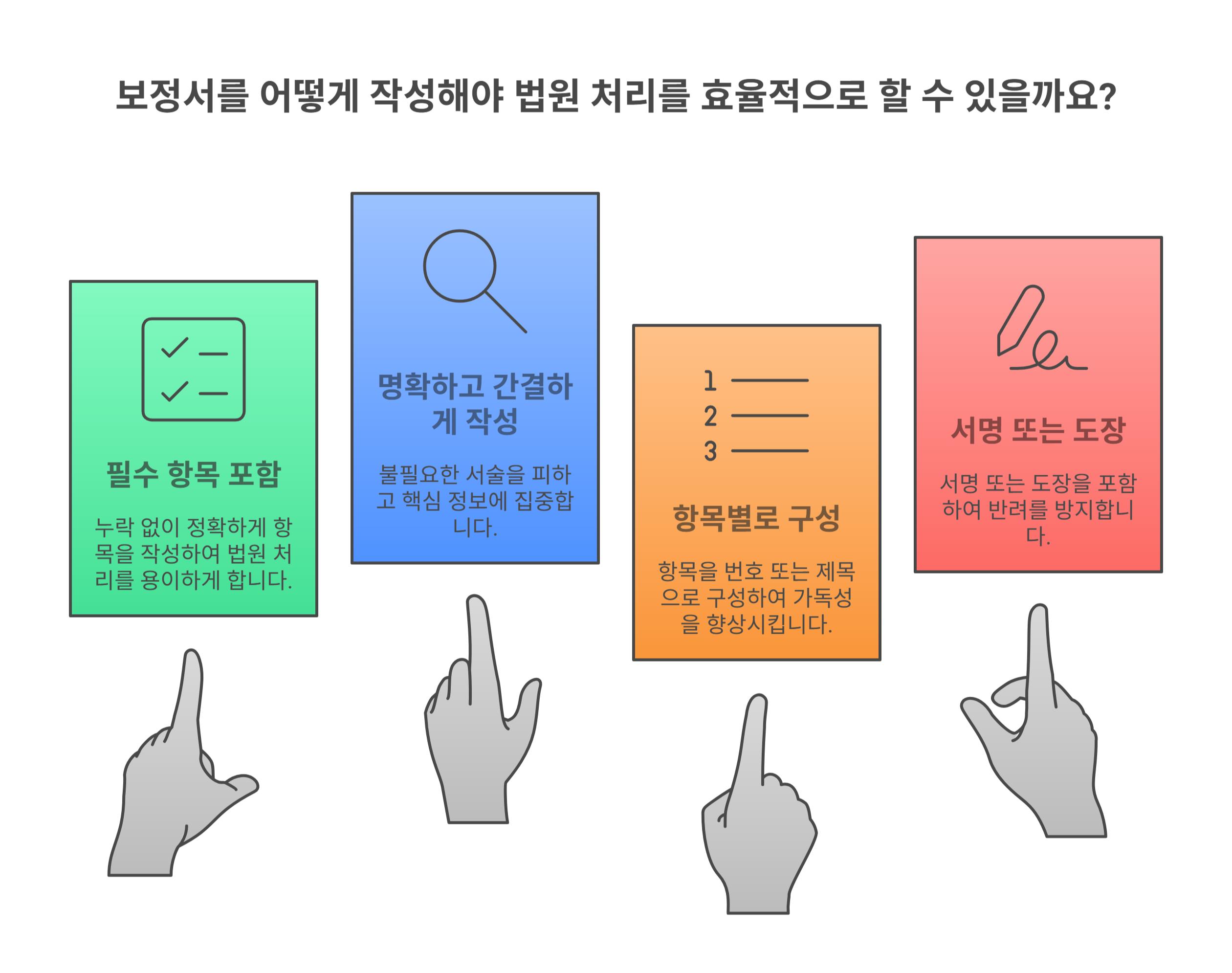 | 보정 사유 | 법원의 보정명령 사유를 기준으로 정리 | 모호하거나 일반적인 표현은 피하기 |