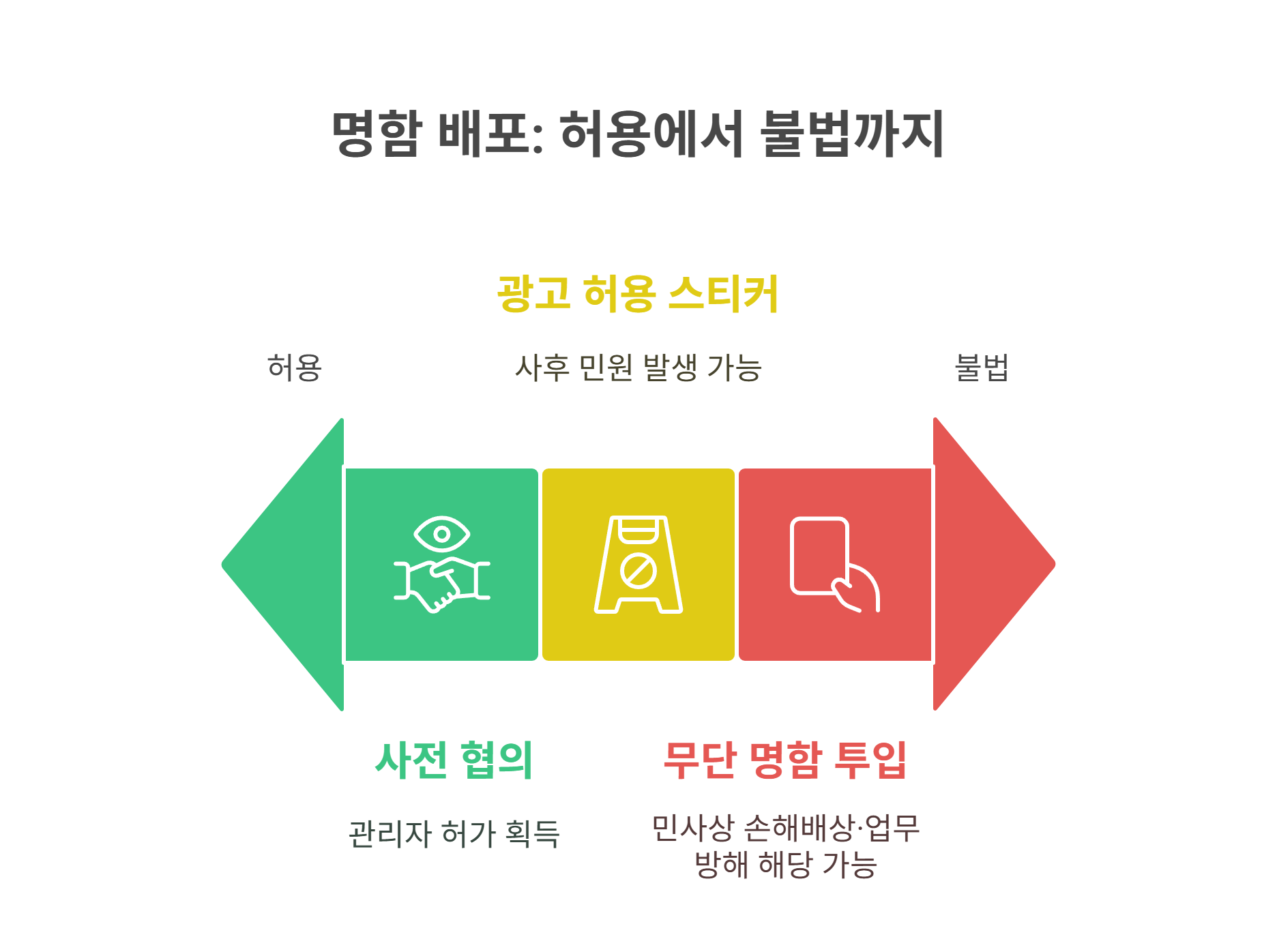 | 무단 명함 투입 | 민사상 손해배상·업무방해 해당 가능 |