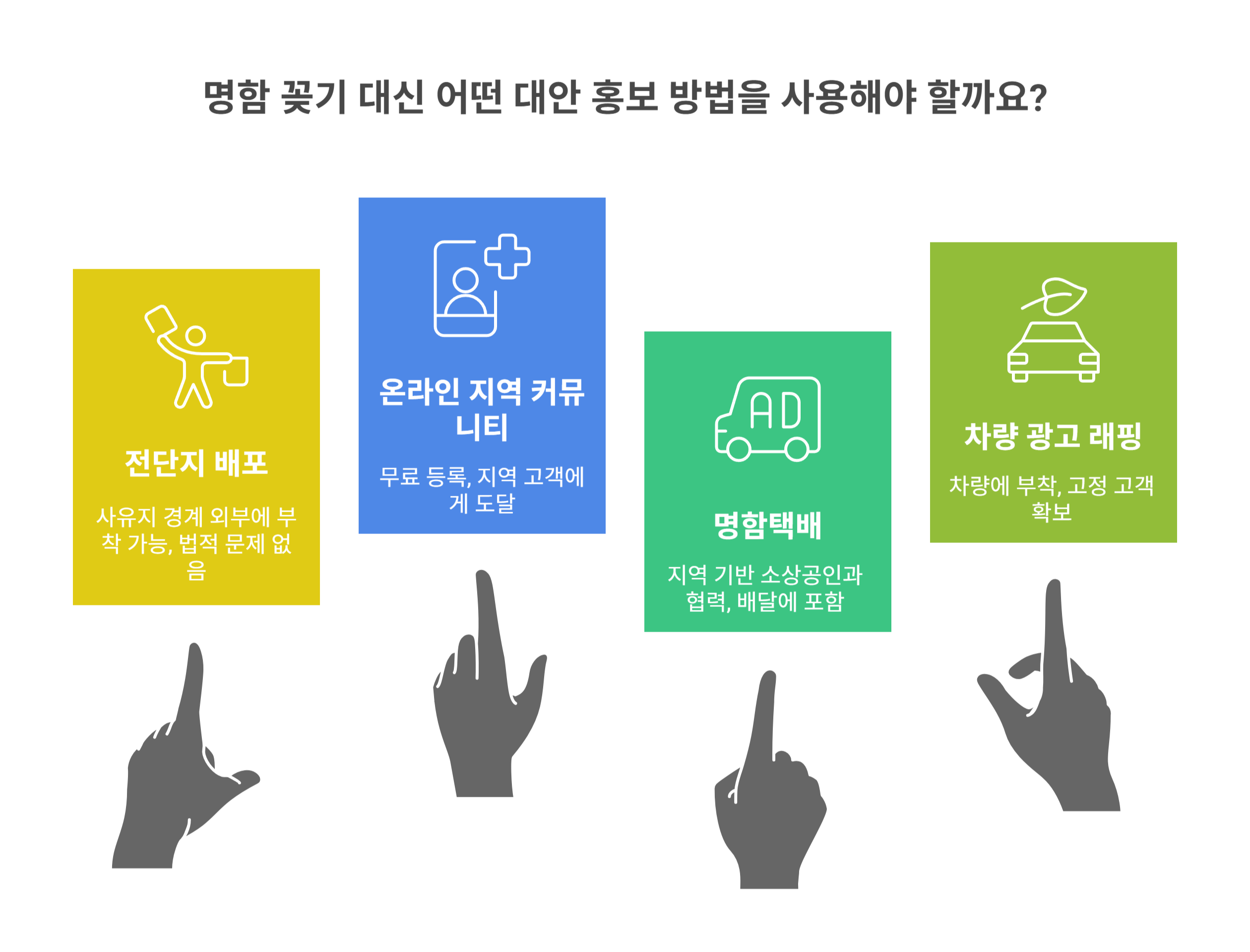 명함 꽂기가 법적으로 부담되거나 거부감이 느껴진다면, 다른 방법으로도 충분히 홍보 효과를 얻을 수 있어요!