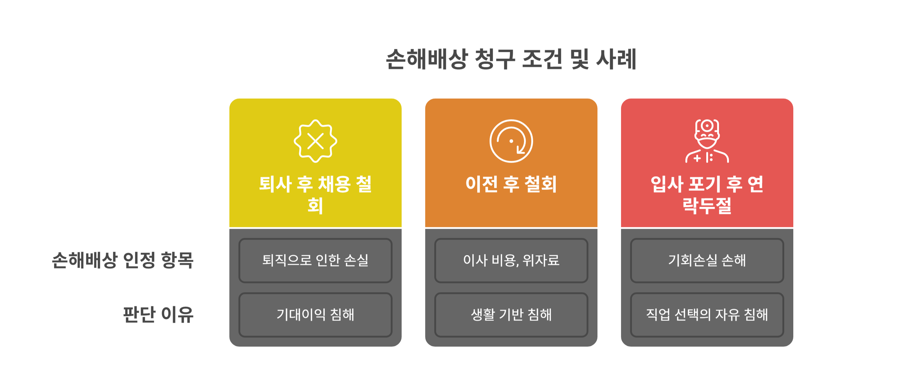이때 인정되는 손해는 통상손해(이직 비용, 대기 손실 등)과 경우에 따라 특별손해(다른 구직 기회 상실, 위자료)가 포함될 수 있어요.