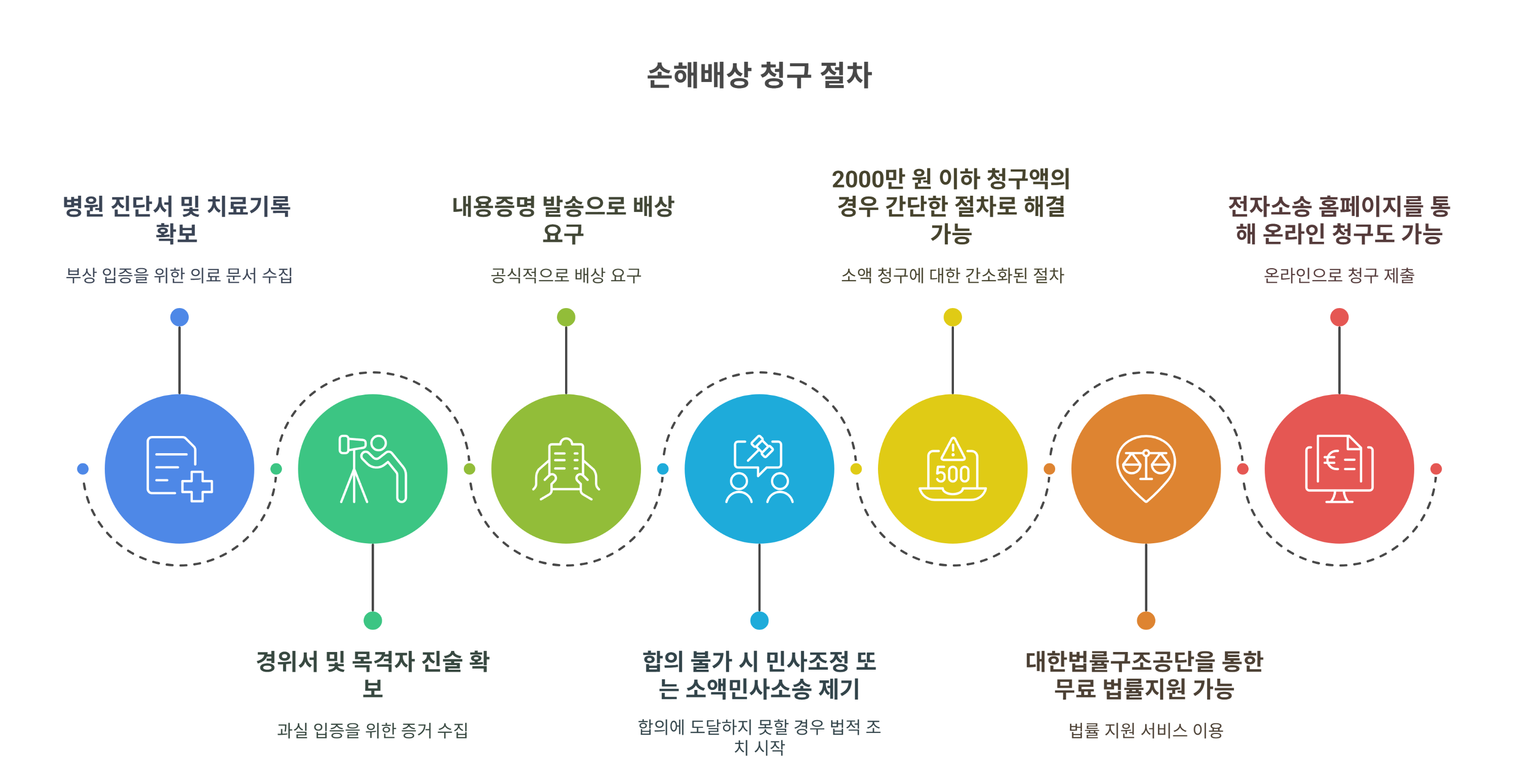 상대방의 과실, 부상 경위, 치료비, 영업 손실 등 명확한 자료가 있어야 하고, 내용증명부터 민사소송까지 단계별로 절차를 진행해야 합니다.