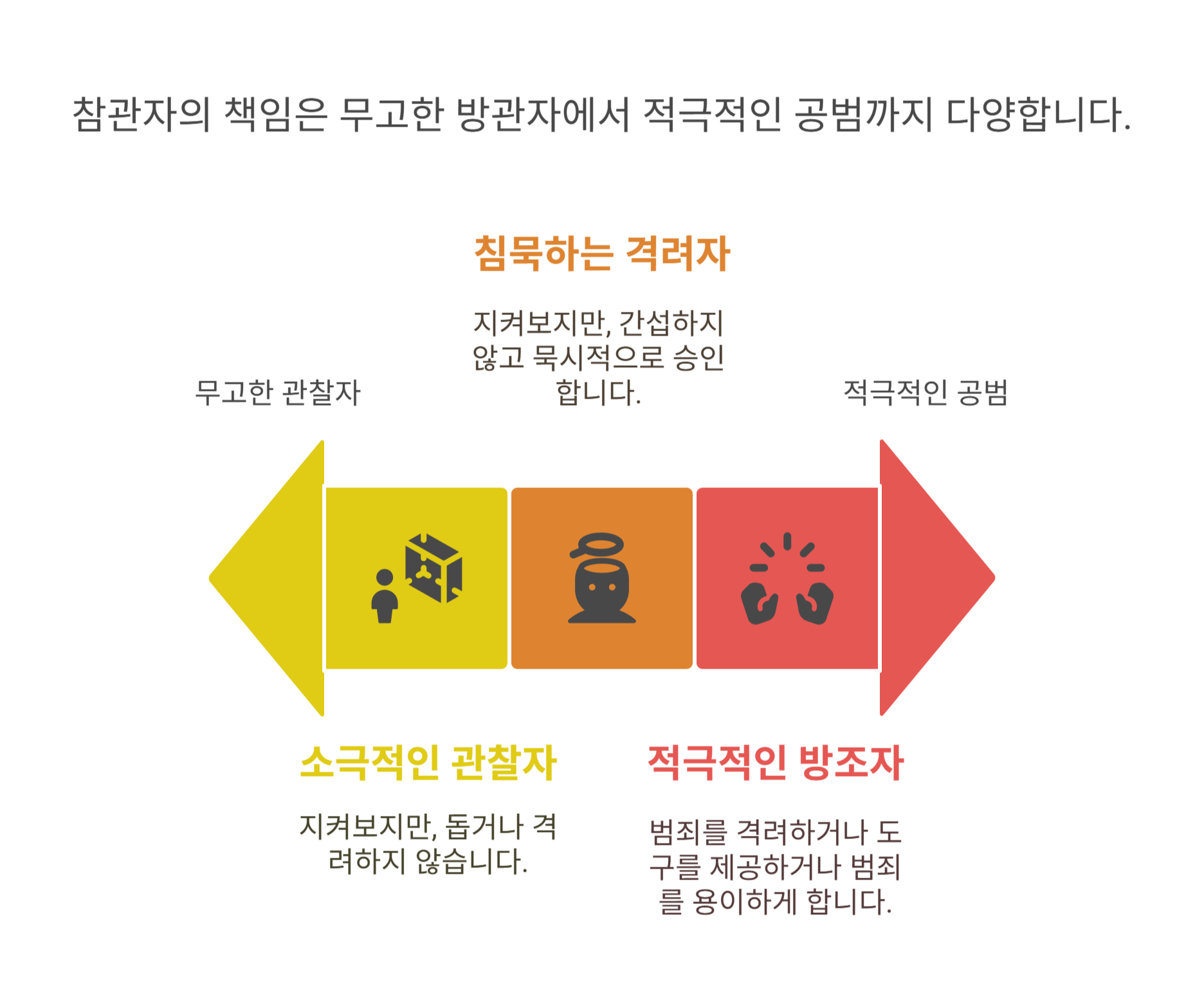 | 소극적 방조 | 행위 말리지 않음, 침묵으로 용인 |