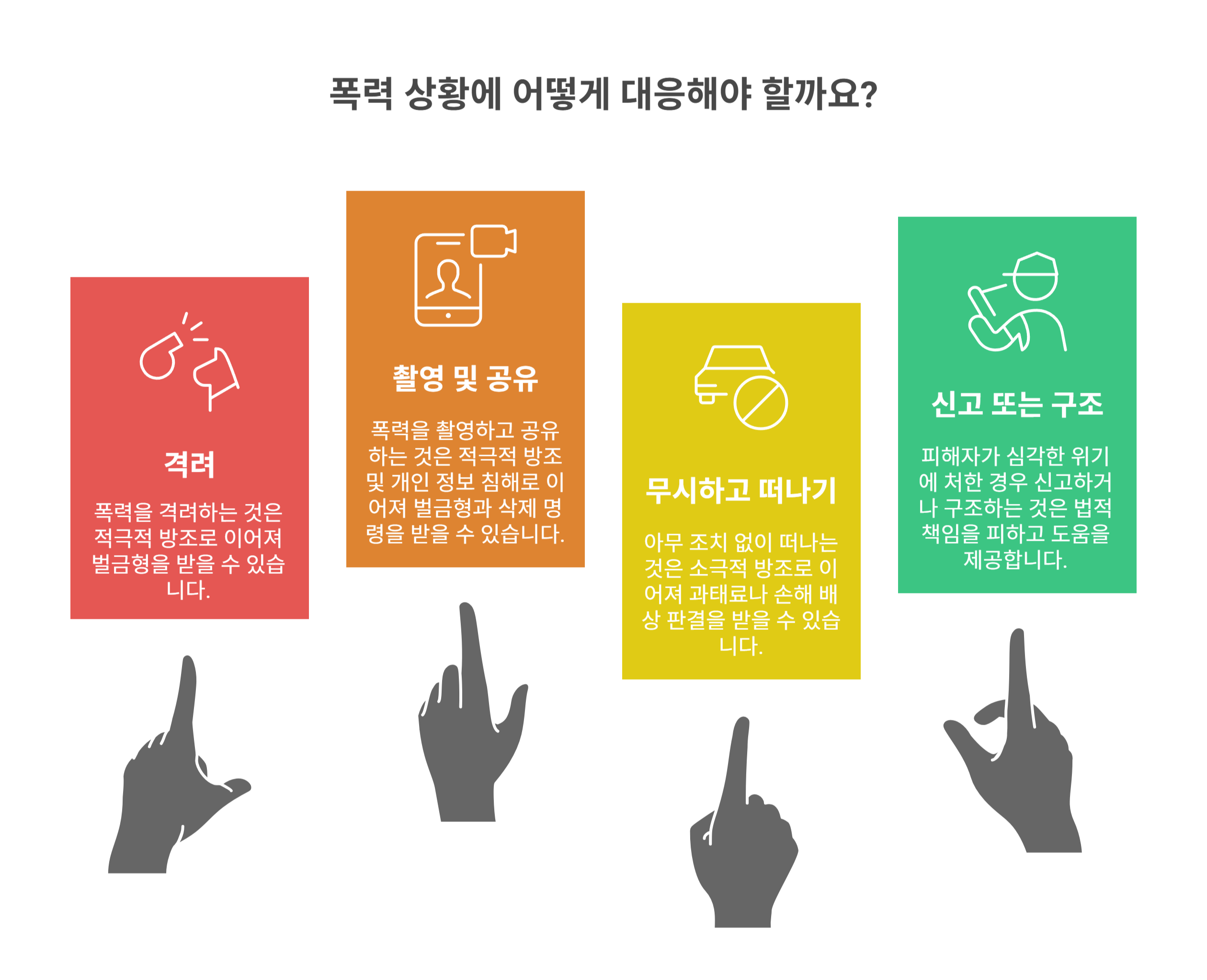 ⚠️ 주의: 다수인이 있는 상황에서 폭행을 방조하는 발언 또는 행동은 모두에게 책임이 돌아올 수 있어요.