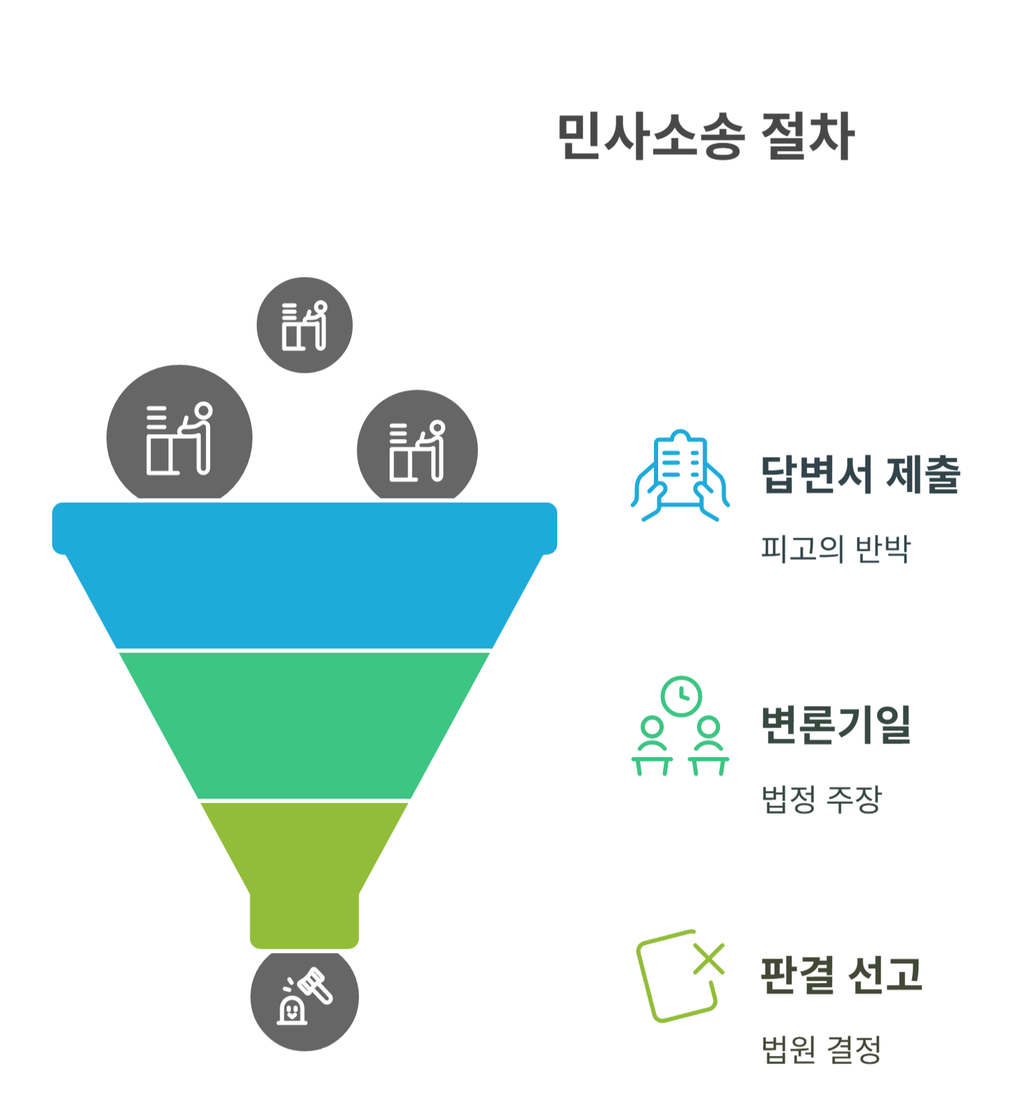 ✅ 민사소송 절차는 '소장 → 답변서 → 변론 → 판결' 순으로 진행됩니다